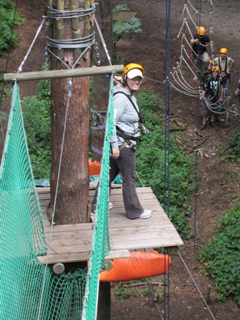 Besonders lockte der neue Parcours X. Mit 20 m Höhe Deutschlands höchster und „gebaut zum Scheitern“ hieß es. Das musste natürlich ausprobiert werden. Doch nicht die Höhe stellte sich als das Problem heraus, sondern die Auslegung des ersten Hindernisses. Es ist eben kein Parcours wie die anderen, nur höher, sondern erfordert permanentes Wechseln der Sicherung und kräftezehrendes Halten am Seil mit einer Hand. Besonders gemein: Das darauf folgende Hindernis konnte man schon sehen - ein Schongangelement! Hier mussten wir uns diesmal für gescheitert erklären und den Rückweg antreten. Aber nur für diesmal, denn somit steht schon das Ziel für unseren nächsten Besuch fest!