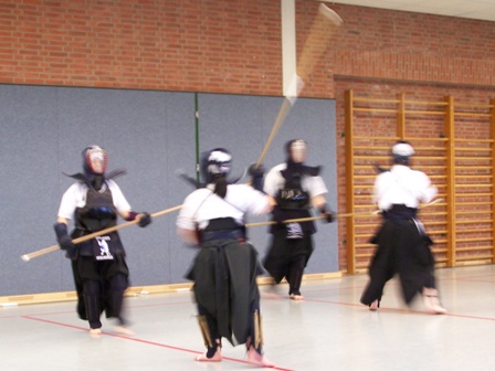 Trotz der Anreiseprobleme hatten wir im Laufe des Wochenendes ausreichend Zeit, für Anfänger und Fortgeschritten angemessen zu trainieren. Am Samstagmorgen polierten wir die Grundtechnik und mittags ging es in die Rüstung. In der Mittagspause konnten wir Akiko mit einem kalten aber sonnigen Kurzausflug zum japanischen Garten neben dem Bayer-Werk überraschen. Durch winterliche Extraarbeit (hunderte von Reifen wechseln bzw. Stollen backen) und den Virus der Saison konnte leider nur die Hälfte von uns die Zeit zum Training finden. Und so waren wir dann paradoxerweise nach dem Training sogar mehr Leute als währenddessen, da einige Verhinderte zum Abendessen noch zu uns gestoßen sind, um Akiko zu treffen.