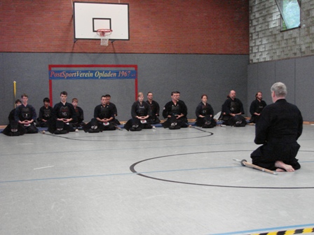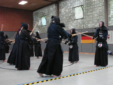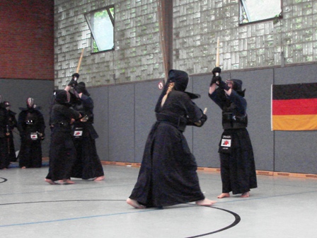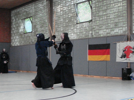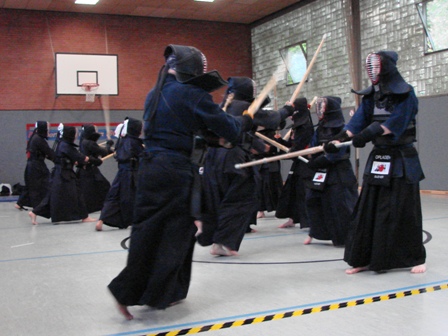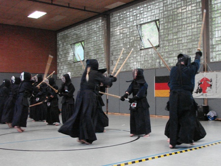 Danach räumten wir das Feld für die Kendô-Gruppe des PSV Opladen. Ludger Fries, der Trainer der Gruppe, kommentierte die Vorführung. Diese war ähnlich wie unsere aufgebaut: Nach den Suburi, die einzeln ausgeführt wurden, folgten die Kihon-Waza mit einem Partner. Bei der anschließenden Kata kam nicht nur das Bokken zum Einsatz, sondern auch das Kurzschert, Shotô genannt. Den Abschluss der Kendô-Vorführung bildete ein lautstarkes, imposantes Jigeiko zwischen allen Partnern.