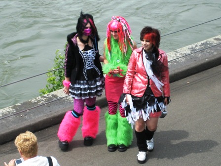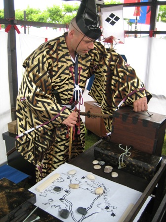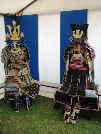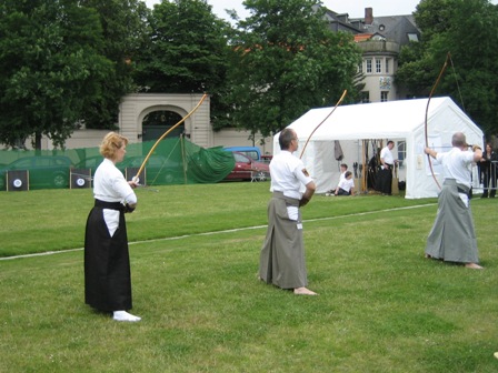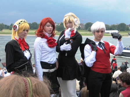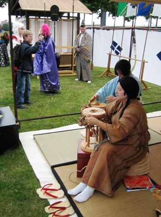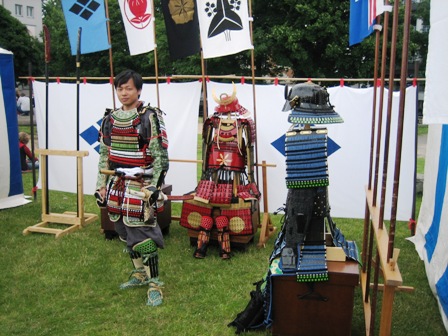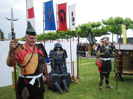 Nachdem es mittags noch sehr schön gewesen war, und sich die bunte Cosplay-Gemeinde, die von Jahr zu Jahr größer werden zu scheint, am Rheinufer zahlreich getummelt hatte, streifte mittags Düsseldorf ein Unwetter, das zunächst die Straßen leer fegte. Leider musste daher praktisch das gesamte Sportprogramm abgesagt werden. Die Sonne kam zwar immer wieder durch, aber die Bühne war und blieb unter Wasser. Die trockenen Pausen boten dennoch die eine oder andere Einsatzmöglichkeit. So führten wir recht spontan auf der Uferpromenade Shikake Ôji vor und nutzten die Chance zu einem kleinen beherzten Intermezzo mit einem bewaffneten Cosplayer. Weitere schöne Gelegenheiten zum Handanlegen hatten wir bei unseren Freunden im Heerlager der Takeda mit Naginata-Nachbauten, Kamayari und einer Kanabô, Kaliber Magnum (wo die landet, wächst kein Gras mehr). Die Takeda hatten mit dem Wechselwetter so ihre ganz besondere Freude. Bei Regen drängte sich das Publikum eng in alle Zelte à la U-Bahn Tôkyô und für den Rest des Tages war von Yoroi bis Furinkazan-Fahne alles wohl gewässert.