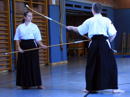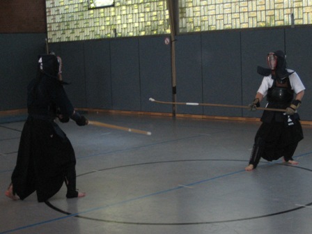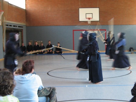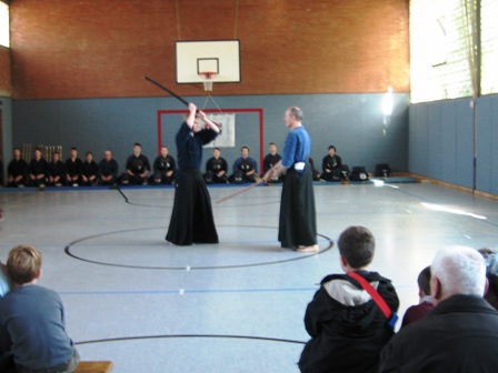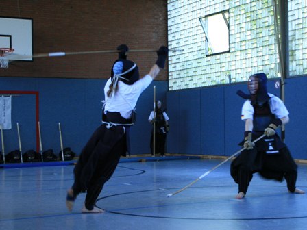 Die Naginata-Gruppe demonstrierte Elemente der Grundtechnik, wie Fußarbeit und Grundschläge, und den Formen-Kanon. Danach zeigte sie angewandte Techniken für den Wettkampf und führte mehrere feurige Duelle vor. Den Höhepunkt bildete die gemischte Begegnung zwischen einem erfahrenen Kämpfer der Kendo- und der Naginata-Gruppe. Angefeuert von den Vertretern der jeweiligen Gruppen zeigten sie einen rasanten Kampf in dem klar wurde, dass zwei Beine bei Weitem nicht genug sind.