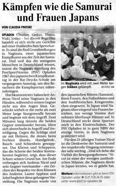 Im Anschluss ergriffen viele der interessierten Zuschauer die Gelegenheit zum Mitmachen und ließen sich in ihre ersten Naginata-Schwünge einweisen. Gleichzeitig informierten sich viele Besucher am Info-Stand bei Kaffee und Kuchen über Ausrüstung und Literatur. Die anwesende Presse jedoch hatte Schwierigkeiten, die Fülle an Neuigkeiten zu Kendo und Naginata anschließend korrekt einzusortieren.