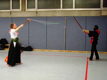 Benkeis große Waffenkammer wurde weit geöffnet und der Inhalt ins Dôjô gekarrt. Damit standen zahlreiche alternative Waffen zur Verfügung wie Katana, Wakizashi, Kama, Kusarigama, Sai, Spazierstock, Knüppel-aus-dem-Sack und Mop (wie in: „Ich putz Dich weg“), so dass zahlreiche ungewohnte Paarungen möglich waren. Kama und insbesondere Kusarigama („Gummiball des Todes“) hinterließen einen bleibenden Eindruck. Im Laufe des Abends stellte sich heraus, dass sich eine Kunoichi (weiblicher Ninja) eingeschlichen hatte, und der eine oder andere lästige Shuriken musste abgewehrt werden, bis sie in einer Rauchwolke wieder verschwand.
