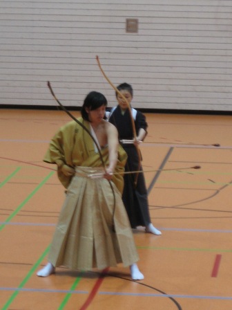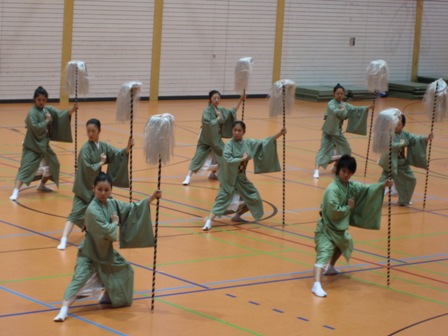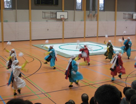 Die Vorführungen deckten die verschiedenen Fächer der Budô-Fakultät ab und beinhalteten auch mehrer Tanzdarbietungen des Fachbereichs „Traditionelle Bewegungskultur“ sowie Taikô-Stücke. Die vertretenen Disziplinen waren: Kyûdô, Sumô, Aikidô, Jûdô, Karate, Shorinji Kempô, Naginata und Kendô (siehe auch Bericht aus 2008). Wieder einmal waren es die Karateka, die bei ihrer zweiten Vorführung mutig wurden und komische Elemente einfließen ließen. Wie im Vorjahr beinhaltete der Naginata-Programmpunkt sowohl Jiki Shinkageryû, Rythm Naginata als auch Isshu Jiai. Die große Schwierigkeit bestand jedoch dieses Jahr darin, mit der einzigen Studentin im dritten Jahrgang alle diese Elemente vorzuführen. Daher wurden in den letzten Monaten drei Kendôka „an die Stange gepresst“.