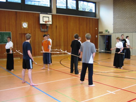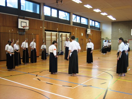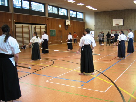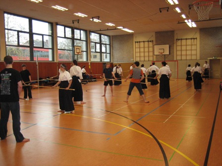 Ein bisschen stolz sind wir schon darauf: Wir haben zum ersten Mal ein großes Naginataseminar samt Prüfungstermin durch und mit unserem Verein ausrichten dürfen – und dem Vernehmen nach sogar sehr erfolgreich. Ehrensache war natürlich, dass der PostSV Opladen geschlossen antrat. Mit 10 Naginataka stellten wir die größte Teilnehmergruppe. Zusammen mit den Opladener Prüflingen sind insgesamt aus vier von fünf Vereinen Deutschlands Teilnehmer nach Leverkusen gepilgert, um sich messen zu lassen. Damit konnten wir rekordverdächtige 29 Teilnehmer zählen – und das trotz des INF-Seminars in Prag, bei dem bereits einige Naginataka aus Deutschland ihre Prüfungen abgelegt hatten.